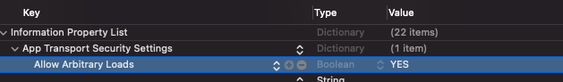 - App Transport Security Settings에서 Allow Arbitary Loads 추가