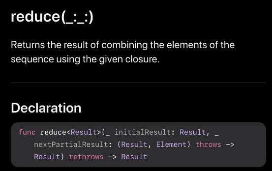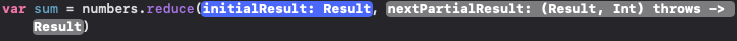var sum = numbers.reduce(initialResult: Result>, <nextPartialResult: (Result, Int) throws -> Result(Result, Int) throws -> Result(_ partialResult: Result, Int) throws -> Result)