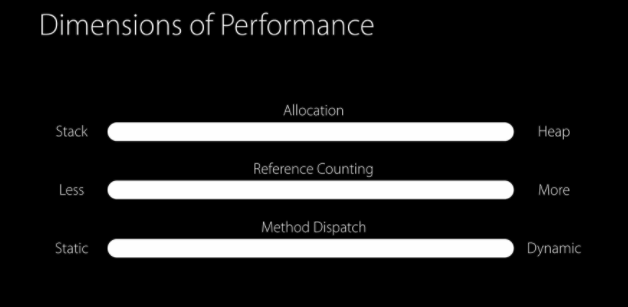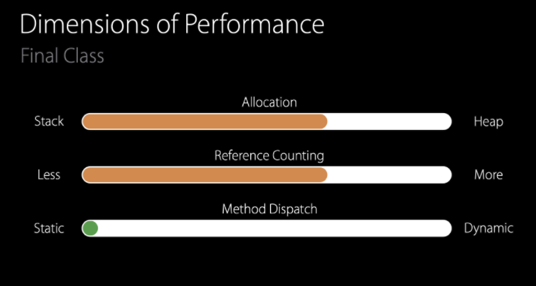 class는 Heap Allocation을 사용하기 때문에 reference counting이 발생하게 되며, dynamic dispatch로 메소드를 호출 합니다. 여러 메소드가 얽혀있는 상황에서는 메소드 인라이닝과 같은 최적화를 할 수 없기 때문에 Static Method Dispatch를 지향 합니다.