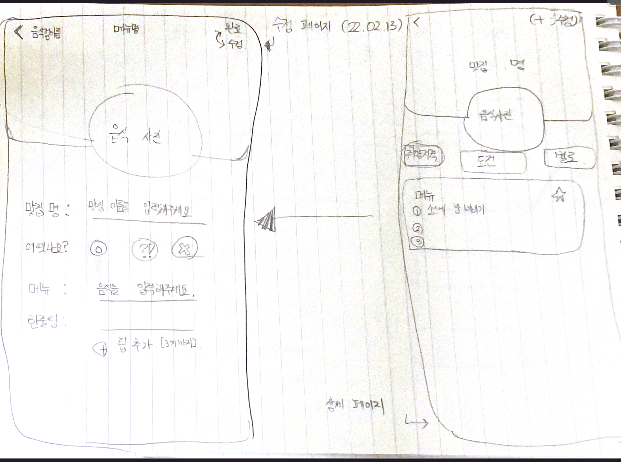 | 맛집 등록 | 메인화면 | 선택된 맛집의 타입별 메뉴들 | 선택된 맛집의 선택된 메뉴 |