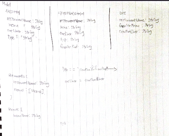 | 초기 메인화면 | Model 구조 | 초기 디자인 (메뉴상세, 수정) | 초기 메뉴상세 페이지 |