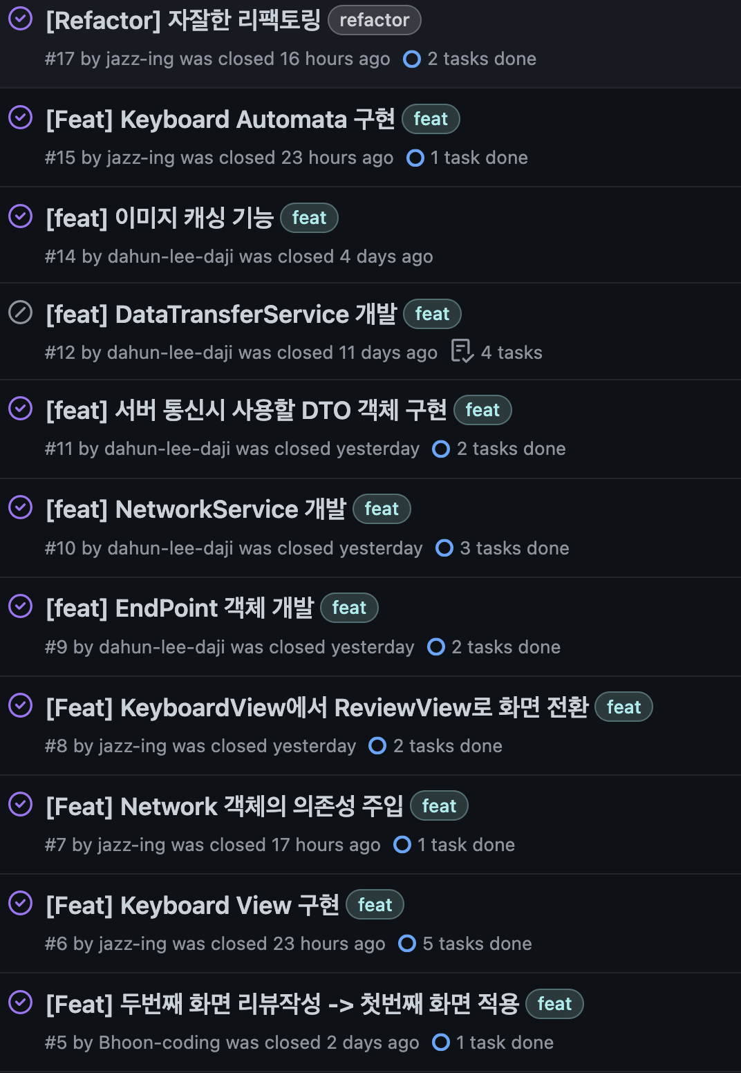 본격적으로 프로젝트를 시작하기전 구현해야하는 기능들을 세부적으로 나누어 issue로 하나 둘씩 적어놓고 해결해 나가는 방식으로 진행을 해서 어떤 작업을 해야할지 명확하게 파악할 수 있었다.