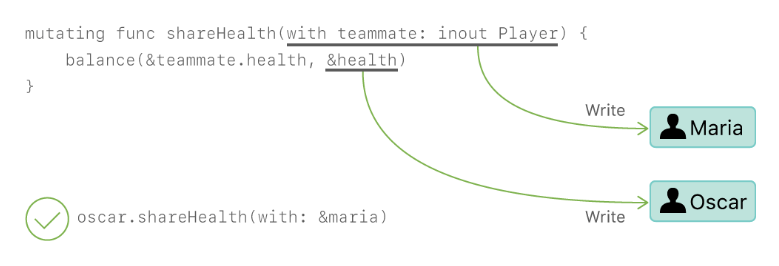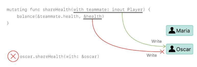 구조체의 mutating func는 메서드 안에서 self에 접근할때 충돌이 발생할 수도 있습니다.