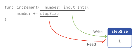 위 처럼 inout 파라미터 number를 읽고, number + stepSize의 값을 number에 할당하면서