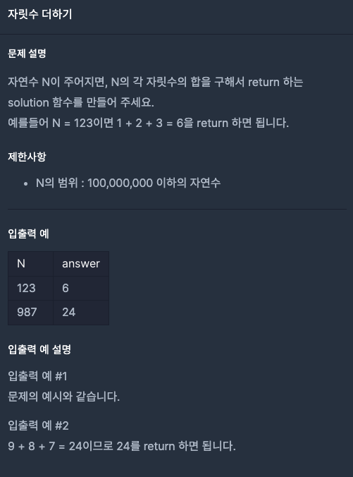 처음엔 파라미터로 들어오는 n을 String 변환 후 split(separate: "") 로 진행했으나,