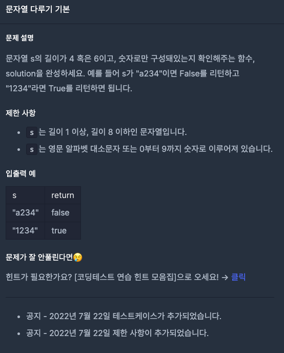 s의 길이가 4 혹은 6 이라는 내용이 있는데, 4이상 6이하로 읽어서 테스트케이스에 실패했었다.