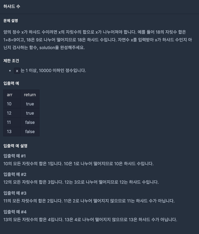 - x % 각 요소별 총합 값이 나누어 떨어지면 true, 나누어 떨어지지 않으면 false 리턴
