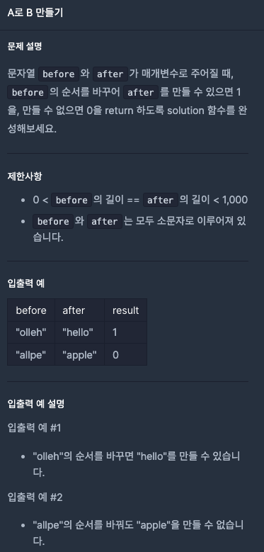 매개변수 befor, after를 다 정렬시키고 같은게 있으면 결국엔 after 문자를 만들 수 있다는 거니까 sorted() 메서드를 사용했다.