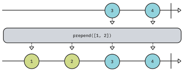 아래처럼 음수 를 추가해도 순서대로 나열 됩니다.var subscriptions = Set<AnyCancellable>() example(of: "prepend(output)") { let publisher = [3, 4].publisher publisher .prepend(1, 2) .prepend(-1, -2) .sink(receiveValue: { print($0) }) .store(in: &subscriptions) } /* ——— Example of: prepend(output) ——— -1 -2 1 2 3 4 */