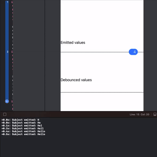print("+\(deltaTime)s: Debounced emitted: \(string)")