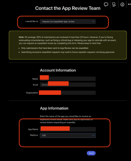 2. 앱 심사 → 빠른 앱 심사 요청 → 앱 심사 팀에 연락 → 아래와 같이 설정