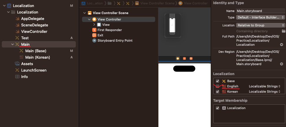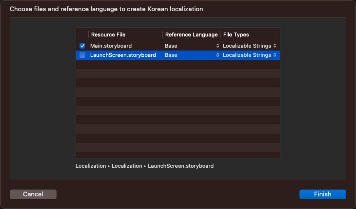 저는 Main 스토리보드만 현지화 작업을 할거라 Main.storyboard만 체크 했습니다.