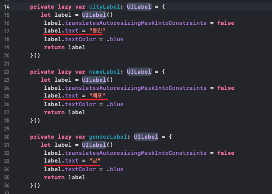 아까 스토리보드에 했던 작업에 코드로 작성한 UI를 추가해 줄건데요. (아래 파란글씨로 된 Label이 코드로 추가한 UI입니다.)