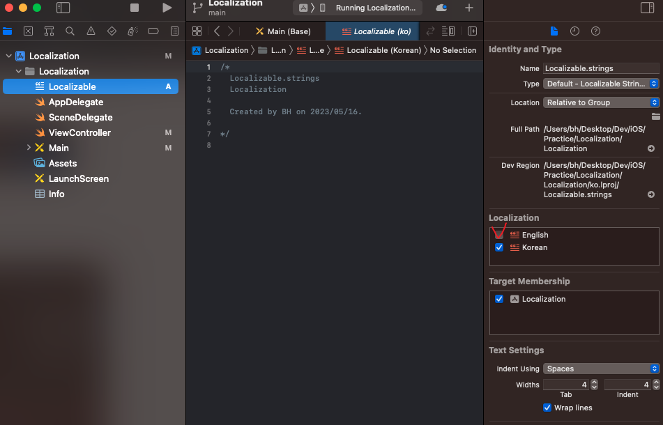 Korean으로 하고 나서 좌측 네비게이터 영역에 Localizable 파일 클릭 후,
