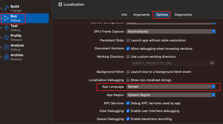 1. Edit Scheme > Run > Options > App Language > 테스트 할 언어 선택