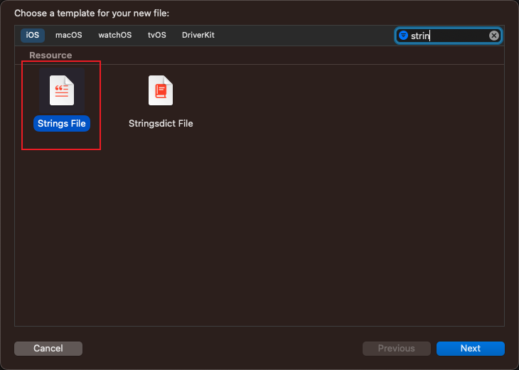 파일추가 (Cmd + N) → Strings File을 추가 합니다.