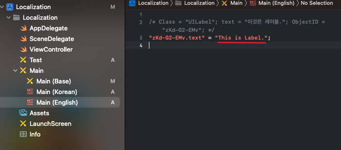 Main(English).strings 파일에 들어가보면 현재 스토리보드에 있는 각 현지화 시킬 수 있는 class 들이 (UILabel 등) 나오는데 아래와 같이 이루어져 있습니다.