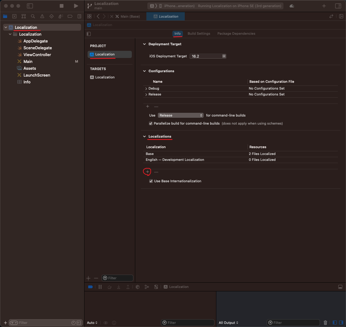 1. Project → 앱 선택 → Info → Localizations 카테고리 → '+' 버튼
