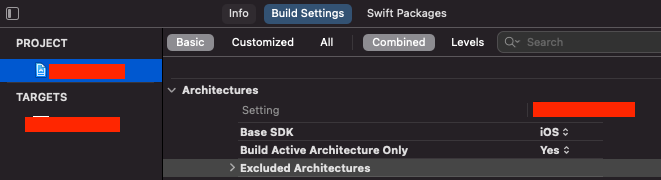 해당 프로젝트 > Build Settings > Architectures > Excluded Architectures > 'arm64' 삭제