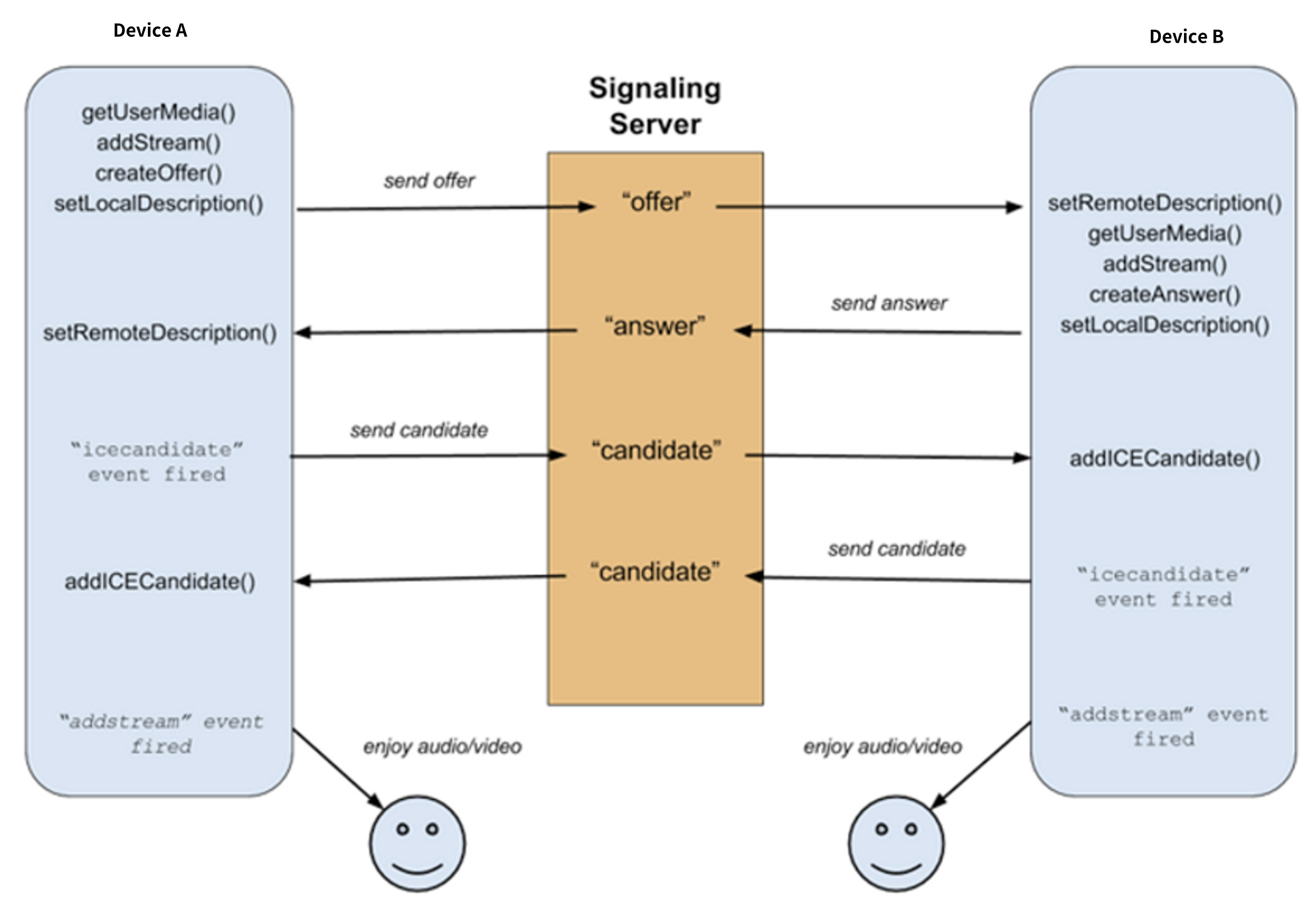 - 시그널링 서버를 사용해 Device A에 answer를 전달