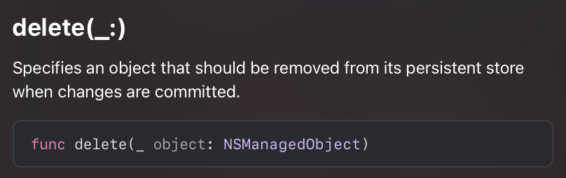 NSManagedObjectContext.delete는 NSManagedObject를 받아 해당 부분을 삭제합니다.
