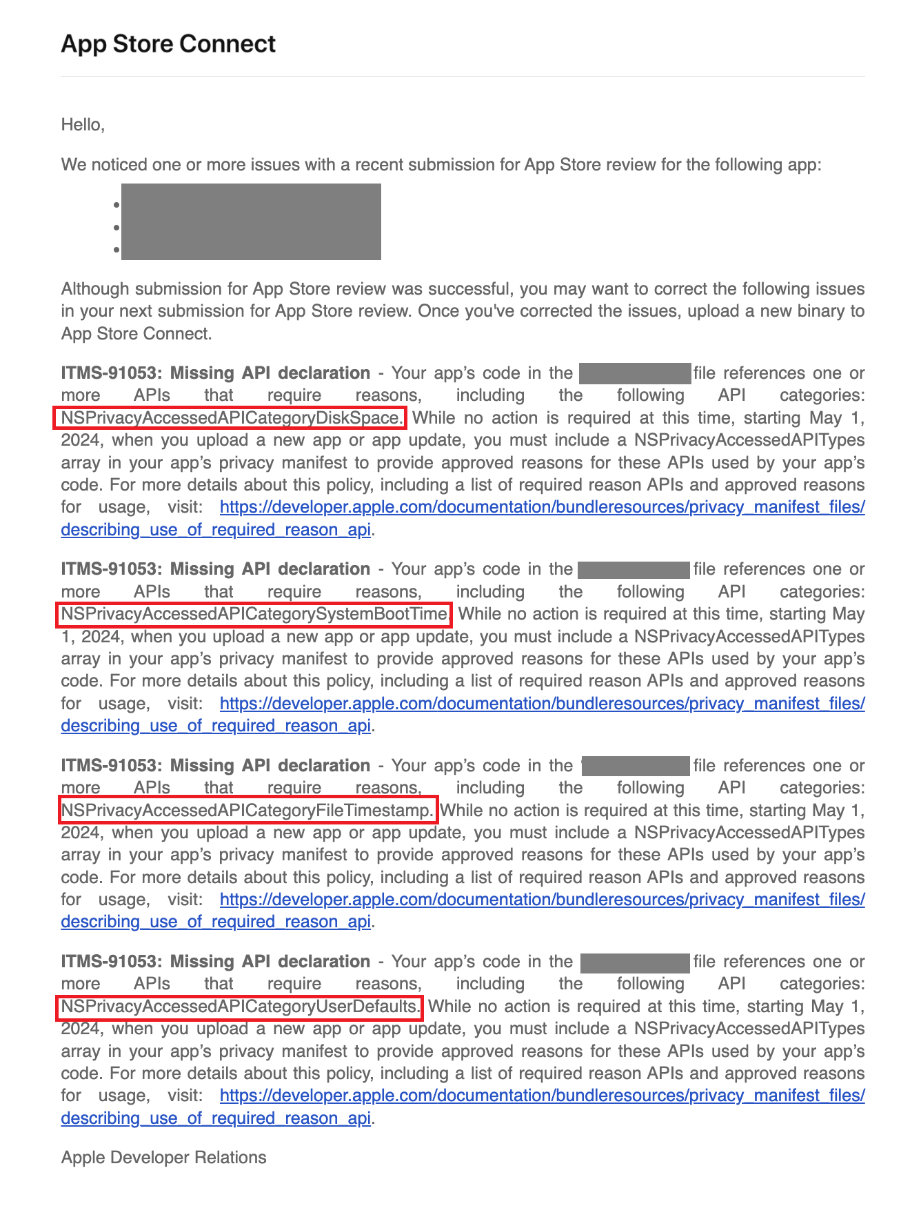 PrivacyInfo 파일에 해당 API 사용이유를 추가하지 않으면 24년 5월부터 앱이 승인되지 않습니다.