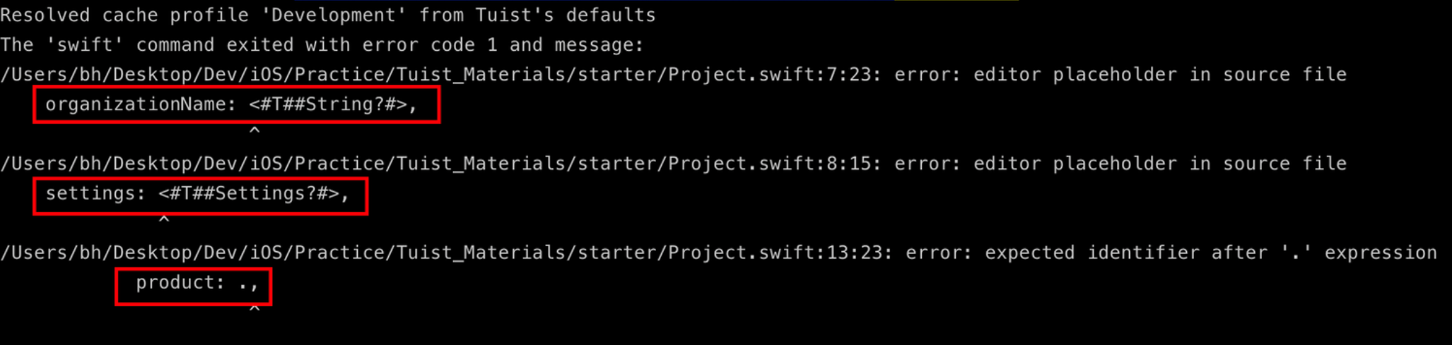 실패시에는 문제되는 부분을 아래와 같이 잘 알려주기 때문에 해당 부분을 수정한다음 tuist generate 해주면 됩니다.