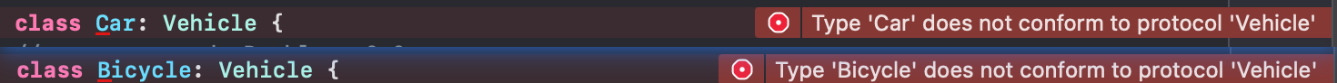 Car, Bicycle 클래스를 만들어 각각 Vehicle 프로토콜을 채택해주면 Vehicle을 따르지 않았다고 에러가 뜹니다.