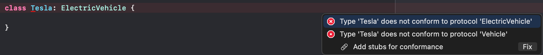 Tesla라는 Class를 만들어서 ElectricVehicle을 채택시켜보면 아래와 같은 에러가 납니다.