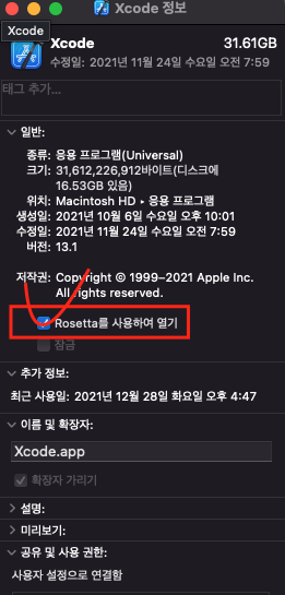 Xcode를 Rosetta로 실행하면 됩니다!!