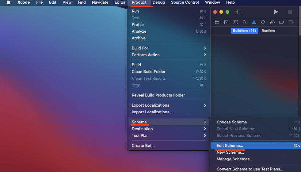1. Xcode 상단 메뉴바 > Product > Scheme > Edit Scheme || 단축키 ( Cmd + < )