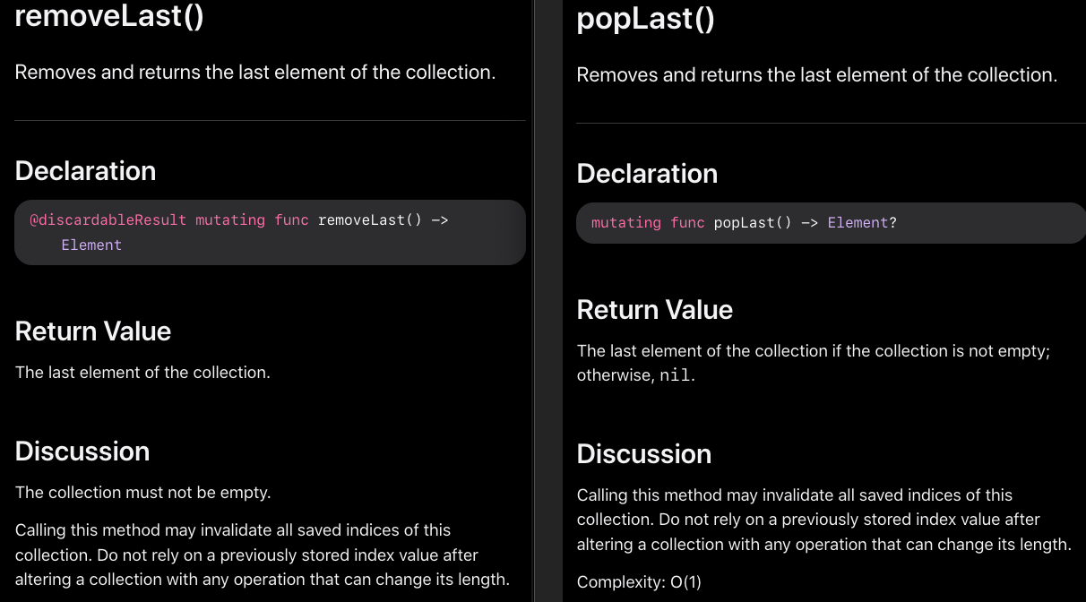 어제 문법 스터디 모임에서 removeLast()와 popLast()의 차이점에 대한 얘기가 나왔는데요.