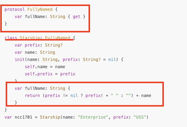- FullNamed 프로토콜이 String 타입의 읽기전용인 변수 fullName을 요구한다.