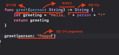 Swift의 모든 함수는 parameter(매개변수)와 return(반환)으로 구성되어 있습니다.