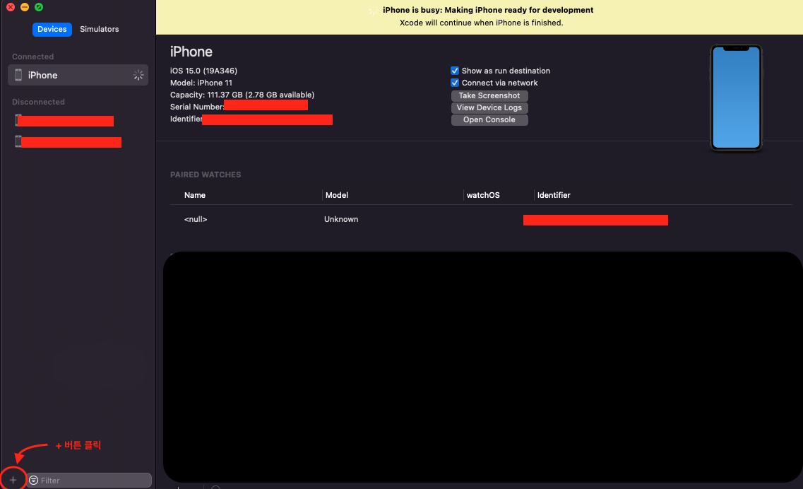 - Devices and Simulators 로 이동 (단축키: Shift + cmd + 2 )
