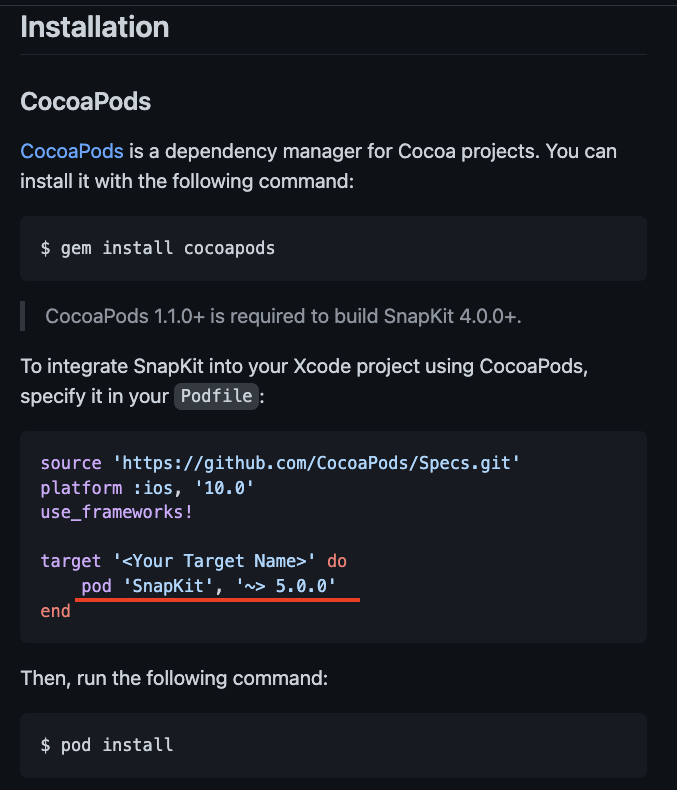 예를들어 'Snapkit을 설치할거다' 라고 하신다면, 해당 라이브러리 github > Install 방법 확인