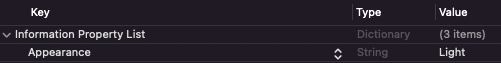 Information Property List 우클릭 → Add row → Appearance 추가 → Value에 Light 입력