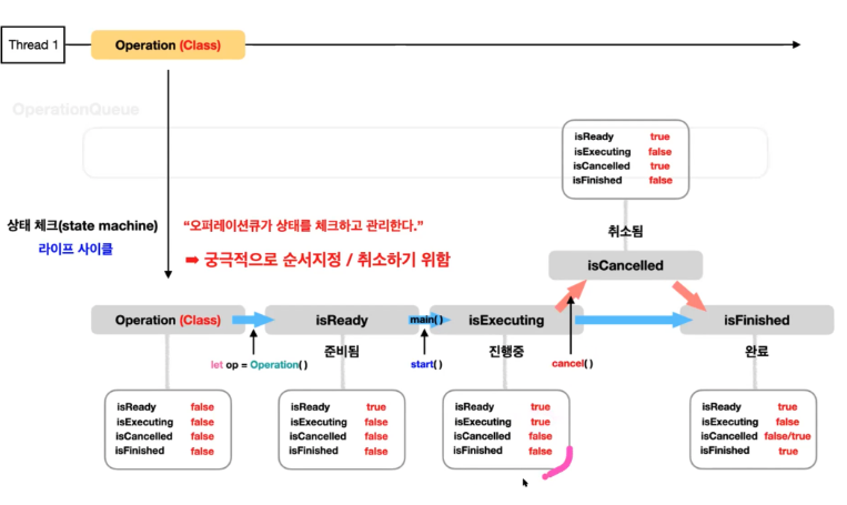 - 작업이 완료된 경우 isFinished = true 로 변경되고 Queue에서 해당 Operation은 제거됩니다.