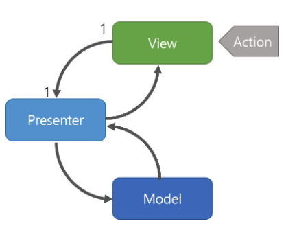 Model, View, Presenter를 합친 용어로, Model, View는 MVC 패턴과 동일 하며, Controller 대신 Presenter가 존재합니다.