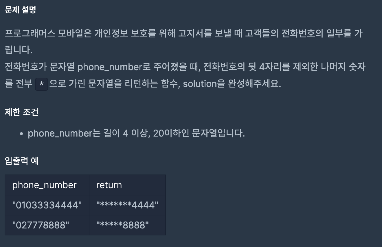 프로그래머스 모바일은 개인정보 보호를 위해 고지서를 보낼 때 고객들의 전화번호의 일부를 가립니다. 전화번호가 문자열 phone_number로 주어졌을 때, 전화번호의 뒷 4자리를 제외한 나머지 숫자